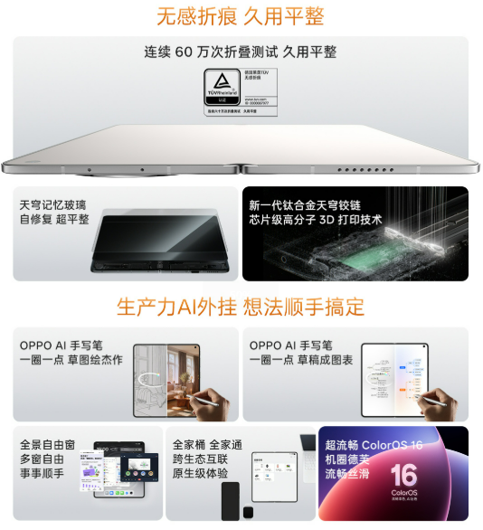其次这几年的AI功能也越来越吃内存,像这一代OPPO Find N6就推出了AI手写笔绘图制表等实用功能,而1TB能为功能部署留足空间,想要轻松玩转AI,手机内存大很有必要。再算上超绝无感折痕、哈苏2亿超清四摄、IP56\IP58\IP59满级防水、1TB版本特有的卫星通信功能等等升级,综合体验直接拉满!