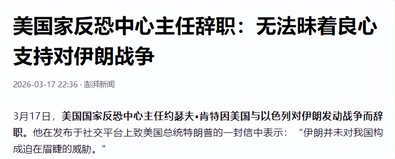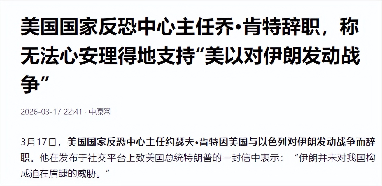 3月17日,肯特公开辞去了美国国家反恐主任的职务,他表示无法接受特朗普违背“美国优先”,单纯为以色列攻打伊朗的做法。