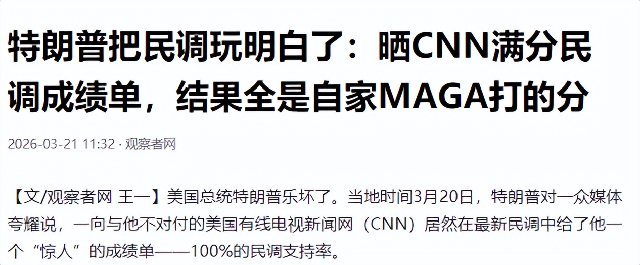 1.《特朗普把民调玩明白了:晒CNN满分民调成绩单,结果全是自家MAGA打的分》