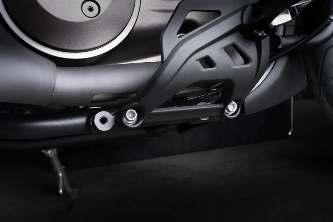 同样车辆两侧的侧翼盖也跟随车辆线条走向设计,同样后座的脚踏也同样按照车辆线条走向设计,到整个车尾后部都给你一种处理干净利落,没有堆砌浮夸装饰的舒适感!