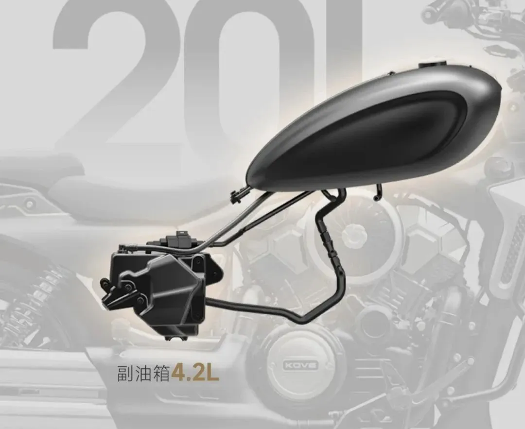 除了轮胎向街车靠外,车辆还向ADV靠了,车上那个好看水滴油箱只是车辆主油箱,容量15.8L,车辆还有一个副油箱4.2L的副油箱,合计20L超大双油箱,长途骑行续航焦虑直接免疫;