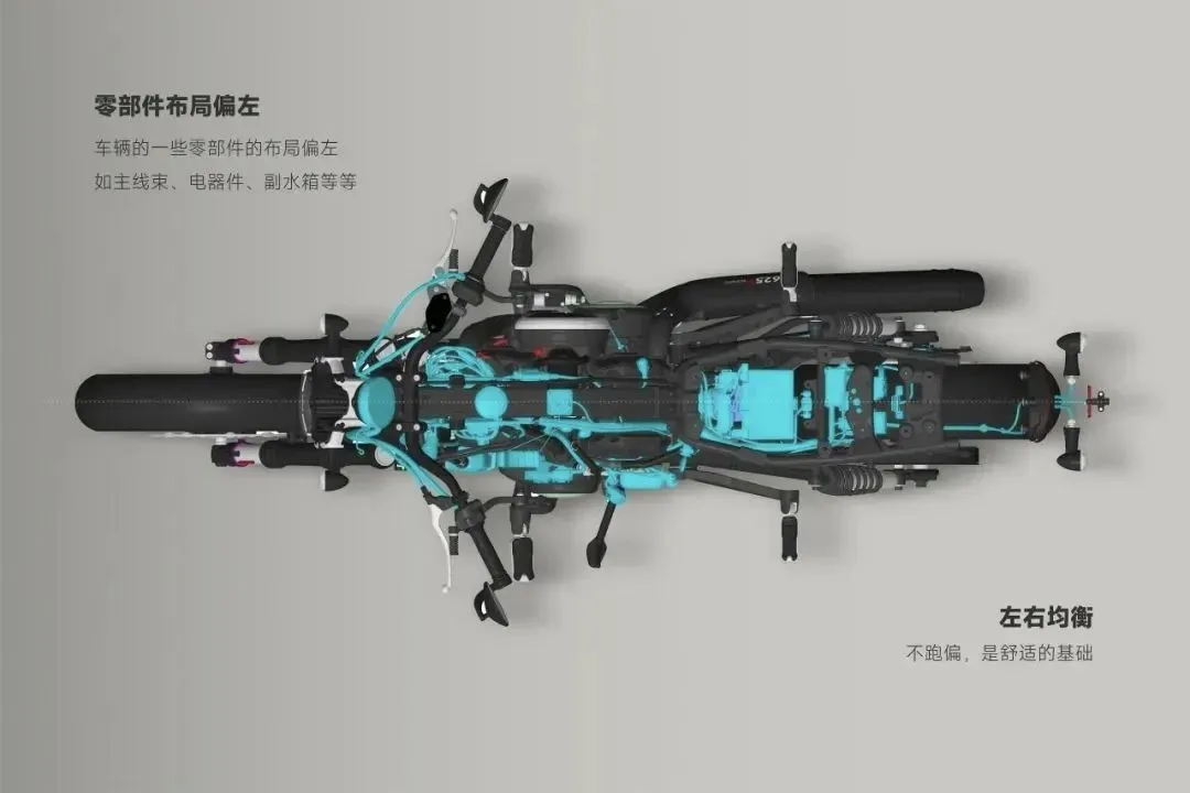 还有车辆的是现在同级别中最轻的,整备重量只有200KG,为了车辆的重量分布均衡还学ADV做了部件靠左的设计,凯越这样做就是告诉你,这是“猎装”巡航,这样能提升灵活性,巡航车的操控性直接拉满,还帮助稳定高速巡航!
