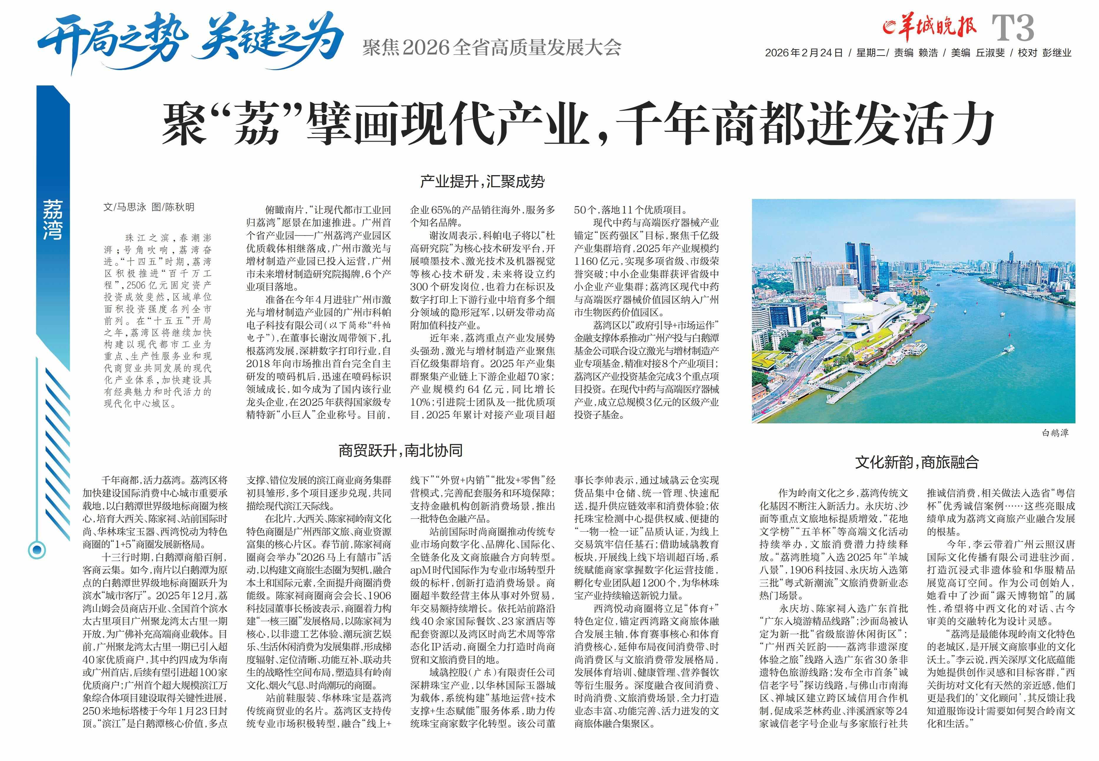 作为岭南文化之乡,荔湾传统文化基因不断注入新活力。永庆坊、沙面等重点文旅地标提质增效,“花地文学榜”“五羊杯”等高端文化活动持续举办,文旅消费潜力持续释放。“荔湾胜境”入选2025年“羊城八景”,1906科技园、永庆坊入选第三批“粤式新潮流”文旅消费新业态热门场景。