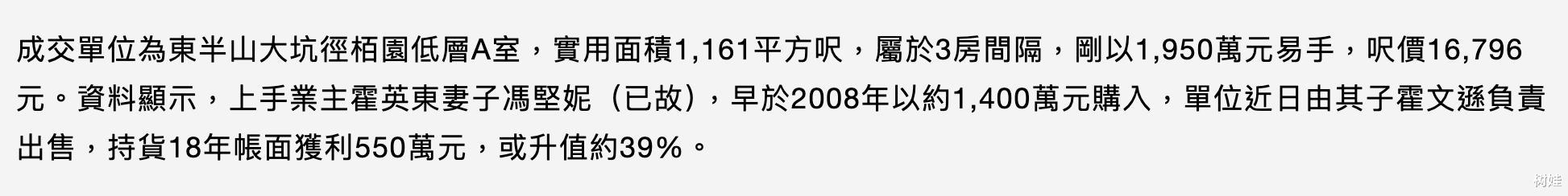 冯坚妮生前名下的这套房产位于东半山大坑径栢低层A室,实用面积为1161平方尺(约合107.86平方米),属于三房间隔的房子。房子所在的屋苑一共有22层,共计88套房子,1972年正式落成,冯坚妮在2008年以1400万的价格买入,买入的是二手房,如今以1950万的价格卖掉,账面获利550万。而以2008年这个时间来计算的,当时冯坚妮已经79岁,很大程度就是她的后人以她的名义买下,纳入其名下,如今冯坚妮离世了,其小儿子霍文逊就顺手出售掉,算上通货膨胀,楼市价格下跌,以及各种印花税,这一买一卖,也不算赚得太多。