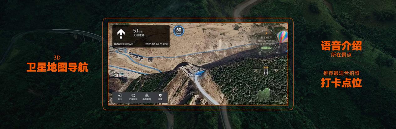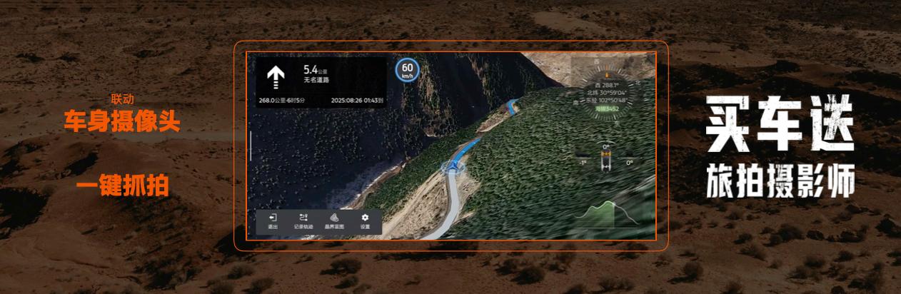 行至“猫鼻梁”等绝佳观景位,路书系统的 “拍照打卡点与无人机放飞点推荐” 功能适时弹出,更可联动车身摄像头一键抓拍壮丽风景,让探险的精彩瞬间得以安全、便捷地记录,堪称移动的“小红书”,让每一次的发现都能成为引爆朋友圈的高光时刻,相当于随车附赠旅拍摄影师。
