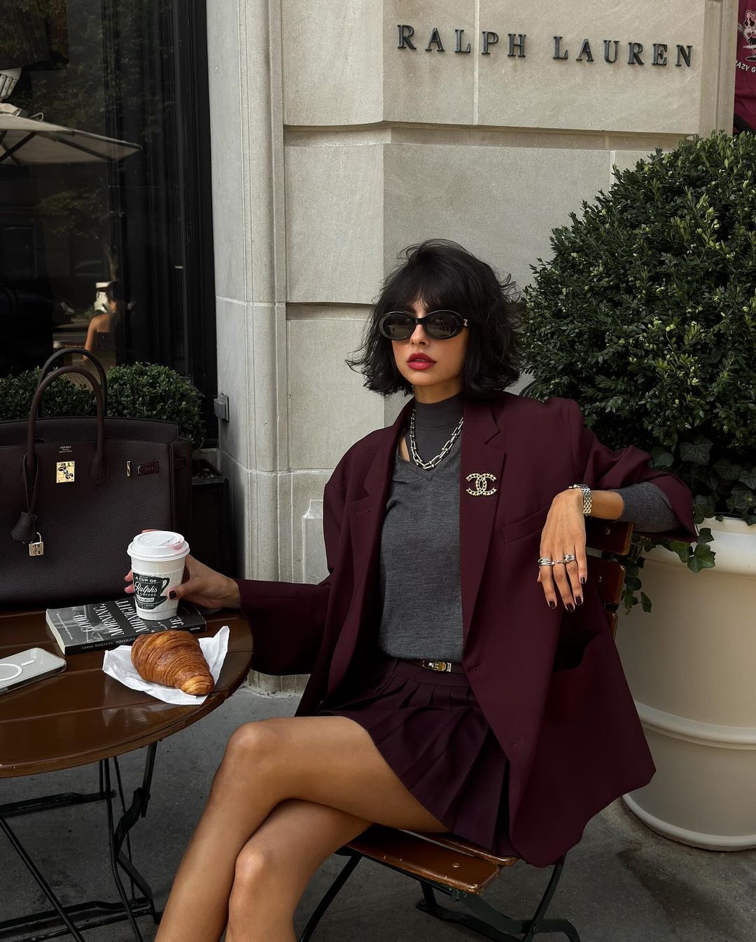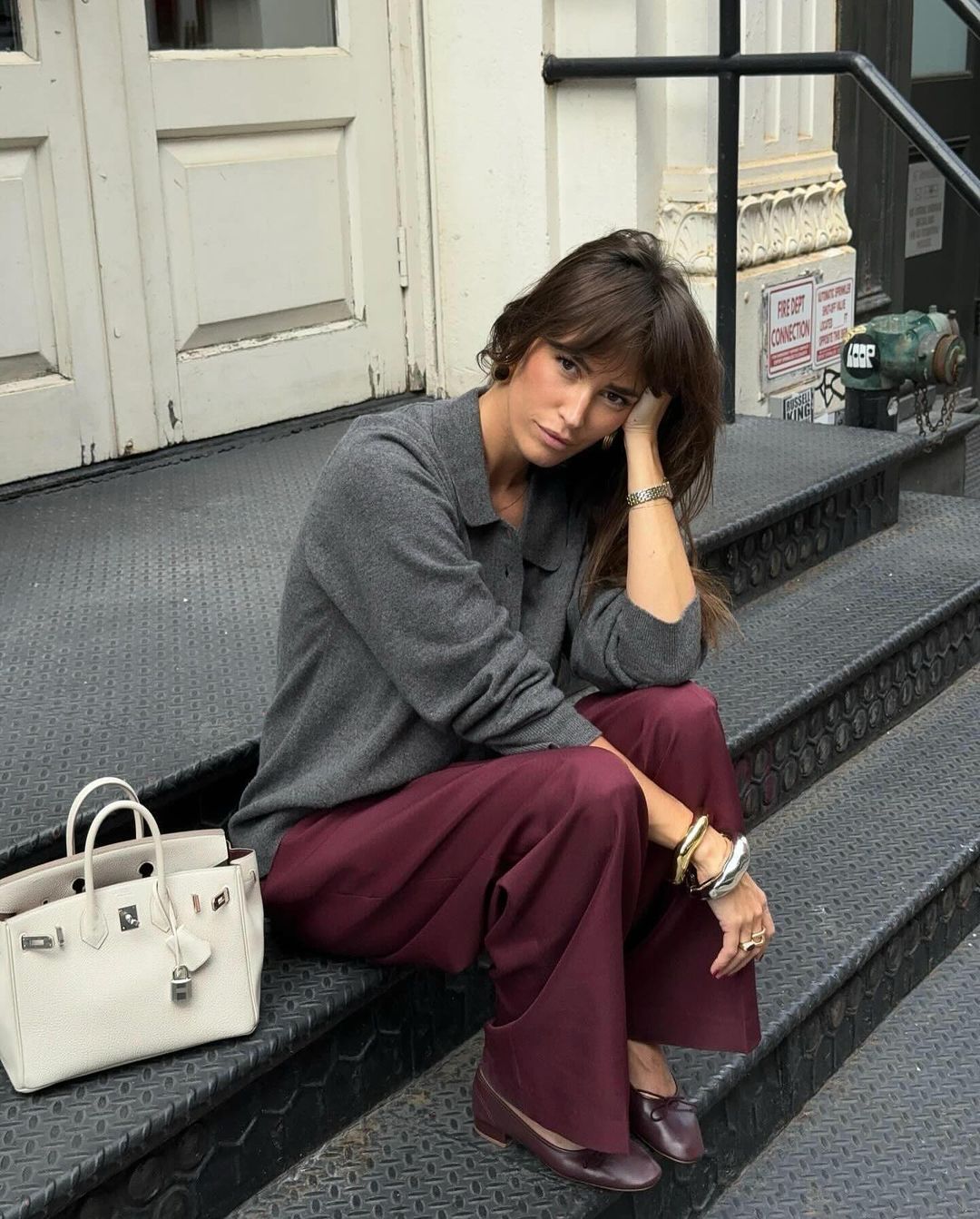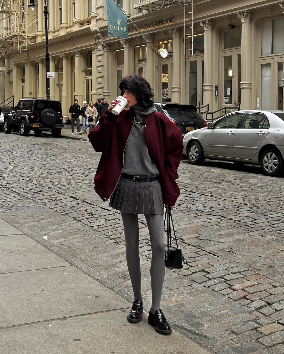 想穿又担心显“老气”?小编建议可以尝试从皮革短款夹克和西装入手,搭配灰色系百褶裙或者是竖条纹衬衫,脚踩平底跟鞋,轻松拿捏深沉浓郁的勃艮第酒红色,因为它自带高级好气质,提升穿搭的level。