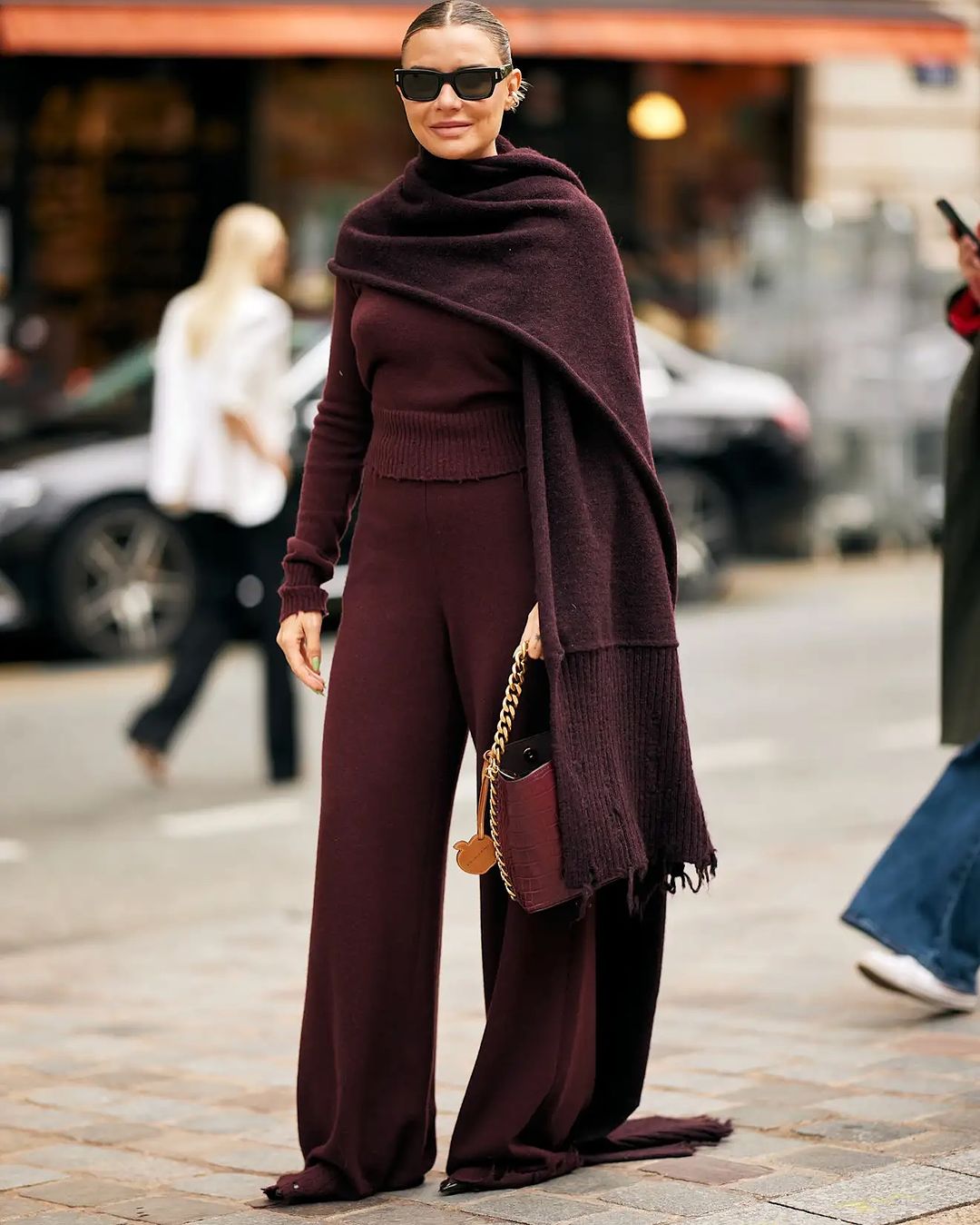 尽管在繁华的都市街头,全身勃艮第酒红色装束,高度和谐的同色系,低调而不张扬,却在人群中赚足了眼球。