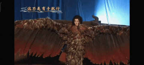 本来,人在空中吊威亚旋转就要体力和勇气。再穿上笨重的鸟衣,做360度旋转,就非常考验体力和旋转带来的眩晕感。