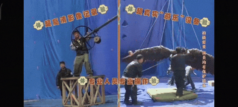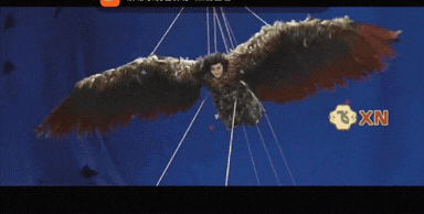其次,乌焰鸟“刘十七”,飞翔在空中的时候,是真人穿进做的巨大鸟身吊威亚飞的。