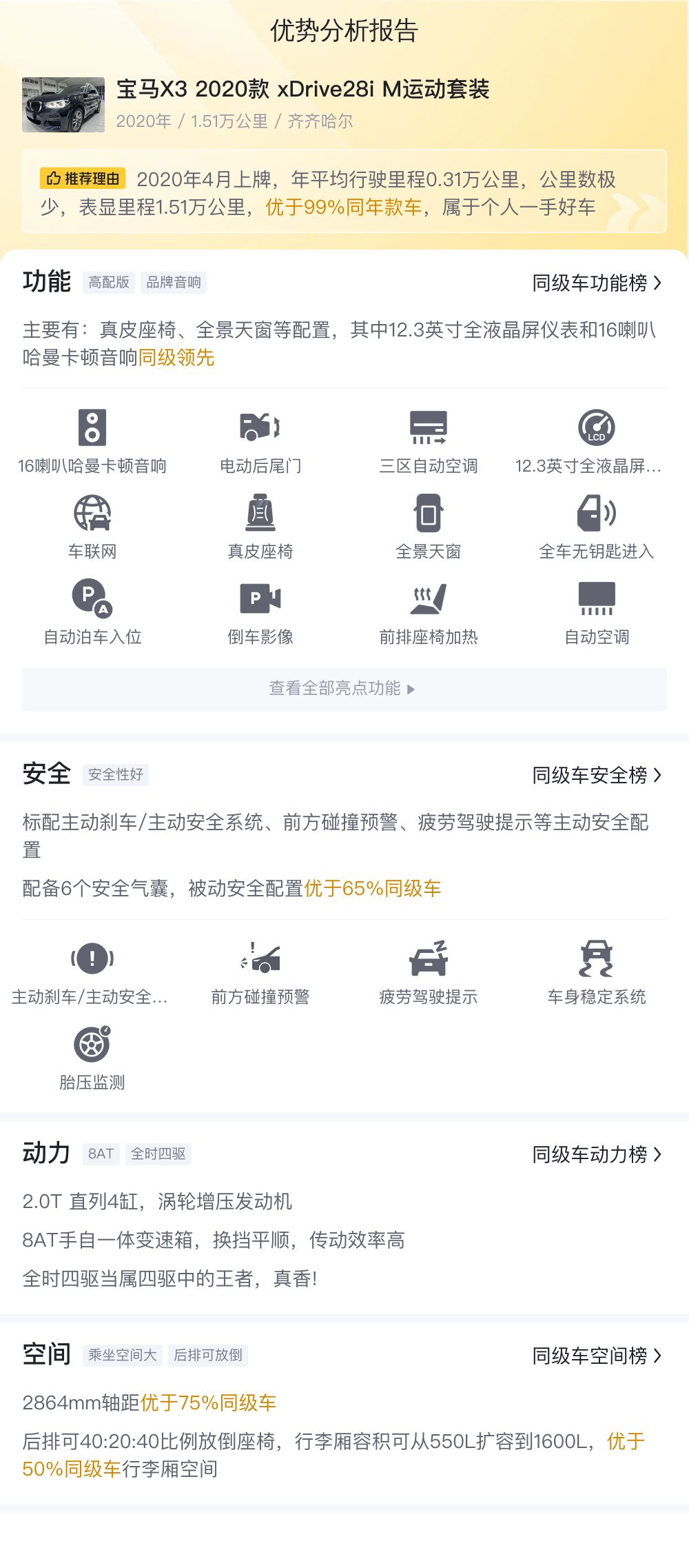 该车于2020年4月在齐齐哈尔上牌,至今行驶了1.51万公里,车源地与上牌地一致,车身颜色为黑色,目前未有过户记录。新车指导价为42.58万元,现二手车报价为21.9万元。