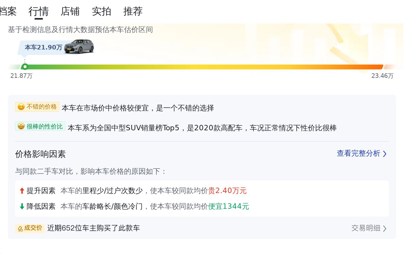 这辆车目前的售价为21.9万元,首付6.57万就可以开回家。在价格因素方面,我们综合考量了里程、车龄、过户次数及颜色等多个重要参数对车辆价值的影响。里程方面,该车行驶里程少于均值5.2万公里,价格较同款车型高出2.21万元。车龄方面,该车车龄多于均值0.1年,价格较同款车型略低500元。过户次数方面,该车过户次数少于均值0.4次,价格较同款车型高出1900元。颜色方面,该车颜色为黑色,价格较同款车型略低844元。综上所述,该车在价格方面具有一定的竞争力,但具体售价还需根据车辆实际情况和市场需求进行评估。