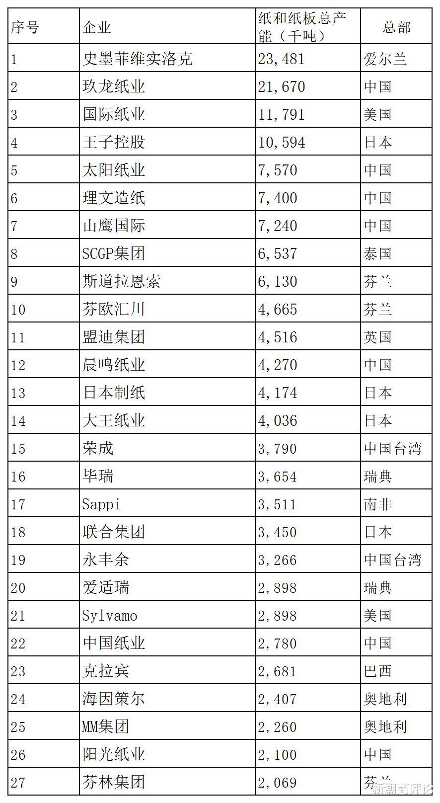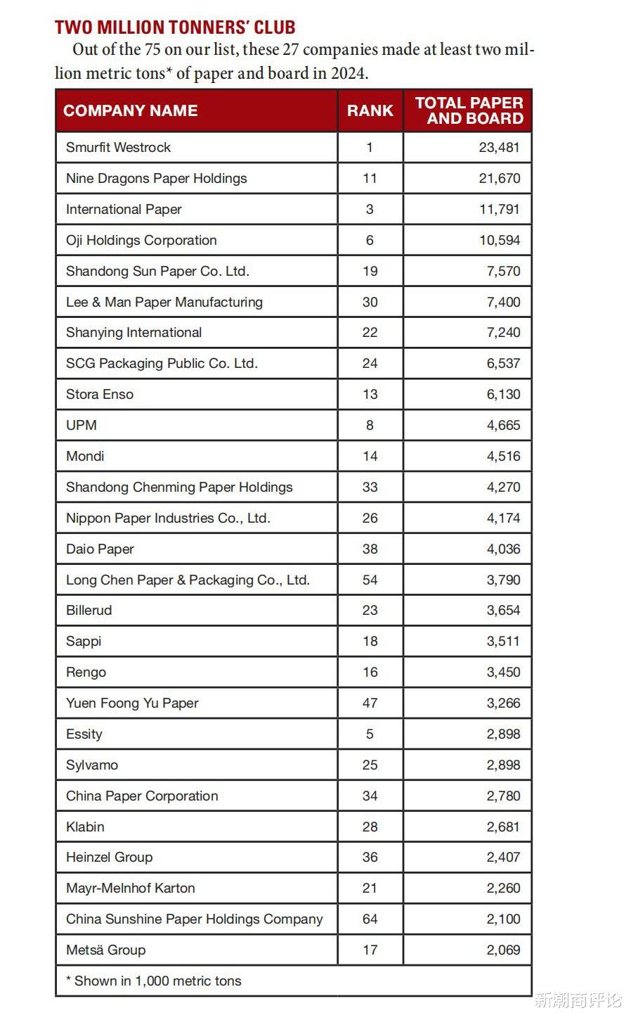有4家企业产量超过1000万吨,除了玖龙纸业,另外3家分别是爱尔兰的史墨菲维实洛克(Smurfit Westrock),美国的国际纸业(International Paper),日本的王子控股(Oji)。