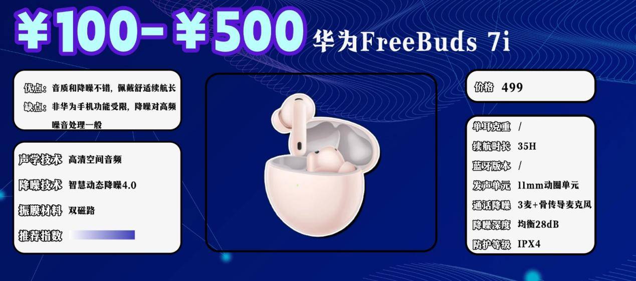 续航表现出色,配合充电盒可实现约35小时使用时间,快充效率也很高。支持多设备连接、智能播报等实用功能,尤其搭配华为手机体验最佳。