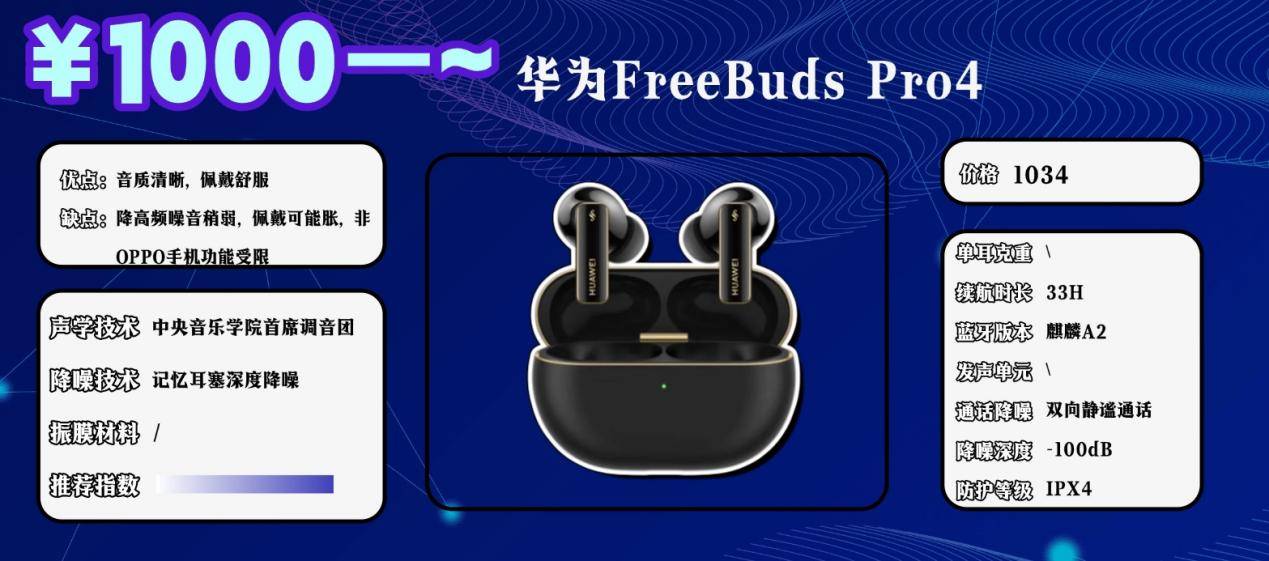 华为这代 FreeBuds Pro 4 延续了旗舰级的定位,整体调音比较平衡,听感自然。它采用混合驱动单元设计,频率响应范围覆盖较广,人声和中频细节表现突出,吉他、钢琴等乐器听起来干净透亮,层次感也比较丰富。高频部分控制得当,不刺耳,长时间听也不会累;低频有一定下潜和弹性,但不会过分强调重低音,更适合喜欢清晰、耐听风格的用户。