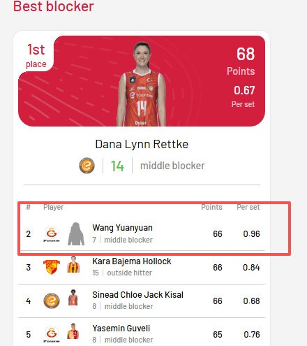 目前王媛媛以66个拦网的总得分排在联赛第二名,比第一名只少2个拦网,而局均拦网0.96个,高居联赛第一,目前她们还有几场比赛要打,和第一名只有2个拦网的差距,因此王媛媛有望拿到土耳其联赛的拦网第一,而这还是她少打了一个多月比赛的结果。之前欧联杯决赛,王媛媛一波七连发帮助球队锁定冠军,所以她的拦网和发球这个赛季的确比较抢眼,这也是天津女排的骄傲。不过王艺竹的球队输球了,而王艺竹本人打的也是非常辛苦。