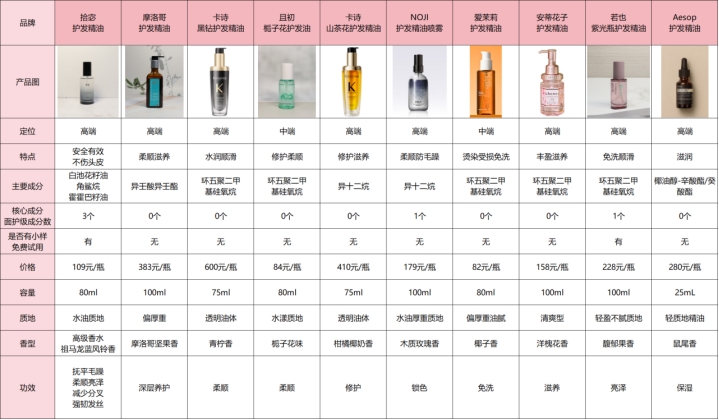 下图为大家展示的是几款护发精油产品的产品数据,大家可以直观的进行对比了解。