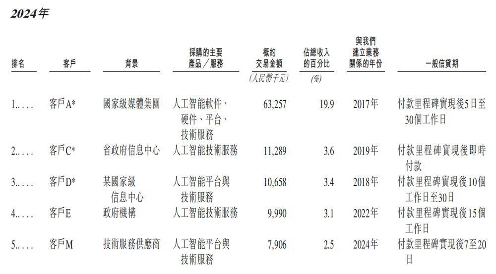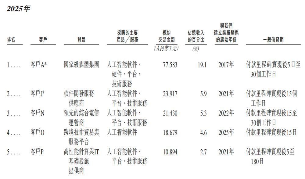 2023年、2024年及2025年,中科闻歌从最大客户获得的收入占比分别为24.3%、19.9%和19.1%,对应金额分别约为0.61亿元、0.63亿元和0.78亿元;从前五大客户获得的收入占比分别为48.0%、32.5%和37.6%,对应金额分别约为1.20亿元、1.03亿元和1.52亿元。