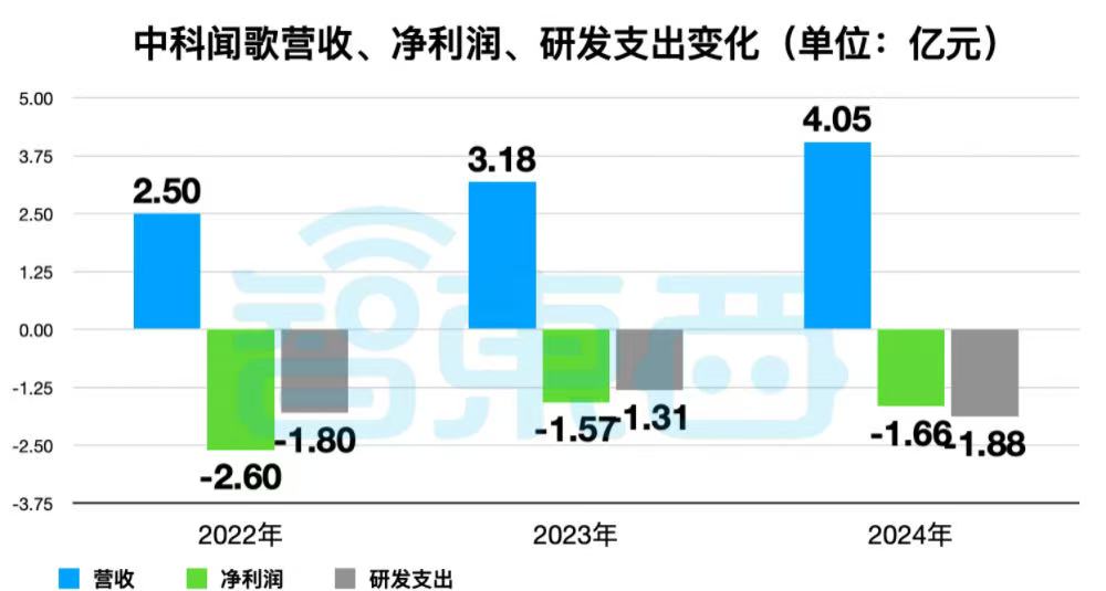 2023年~2025年中科闻歌收入、净利润、研发支出变化(智东西制图)