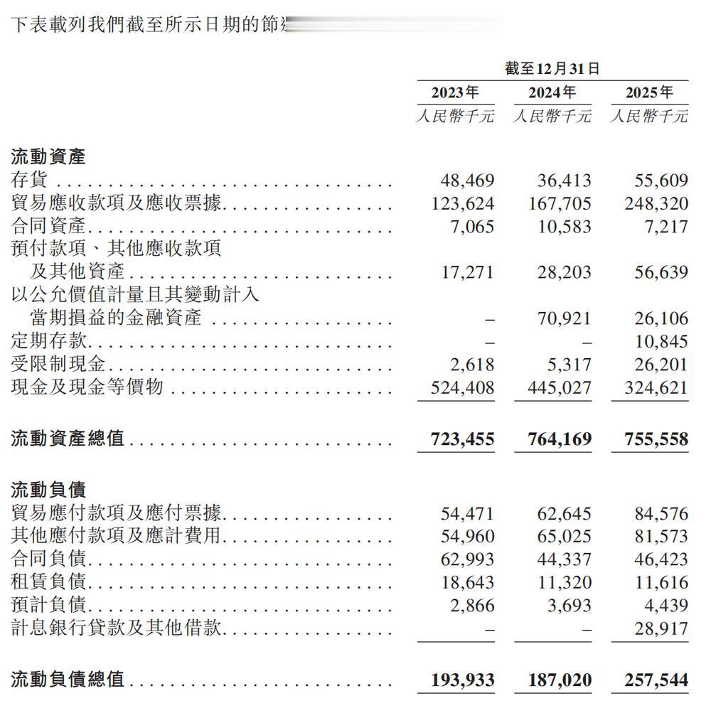 中科闻歌账上现金较为充足,但呈下降趋势。2023年至2025年,其现金及现金等价物分别为5.24亿元、4.45亿元和3.25亿元,持续减少。与此同时,应收账款规模明显增长,同期贸易应收款项由1.24亿元增长至2.48亿元,两年翻倍。