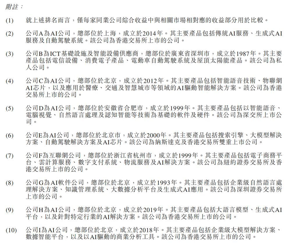 根据灼识咨询,按收入计算,中科闻歌在2024年中国企业级大模型驱动的决策智能服务提供商中排名第一,市场份额为11.4%;在2024年中国企业级大模型市场中排名第七,市场份额为2.4%。在这一市场中,其主要与商汤科技、华为、云知声、科大讯飞、百度、阿里巴巴、拓尔思、智谱和滴普科技等国内主流AI厂商展开竞争。
