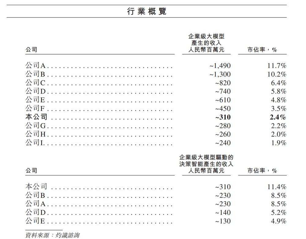 根据灼识咨询数据,按2024年收入计算,企业级大模型与决策智能市场前五大参与者合计市场份额为38.6%,集中度相对有限。