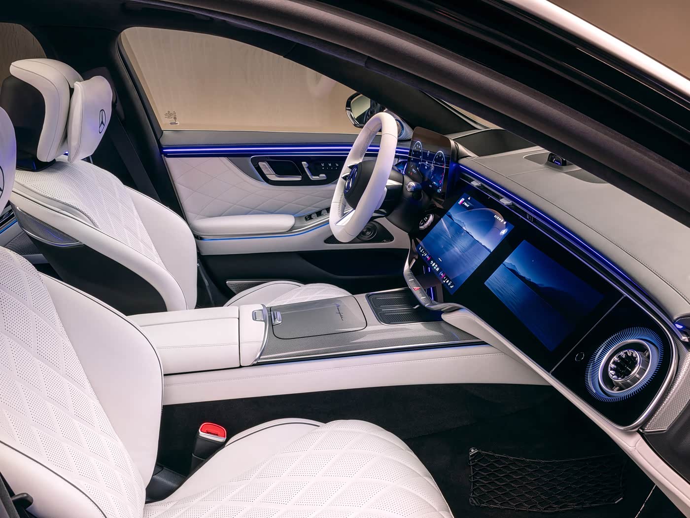 内饰方面,新款奔驰S级可谓焕然一新,全新14.4英寸中控屏与12.3英寸副驾驶娱乐屏采用双联屏形式;全新高端后排娱乐系统由中国团队主导开发,带有两块13.1英寸高清显示屏且支持独立遥控。
