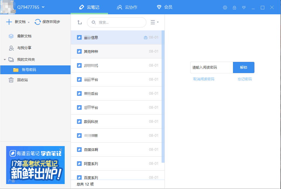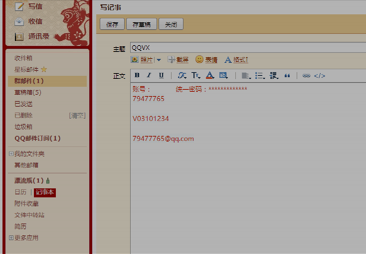 我就想到了一种方法,把账号密码存放到QQ邮箱的记事本里面。但是时间久了还是发现了一个弊端,没有搜索功能,找某个账号密码的时候要翻上半天。