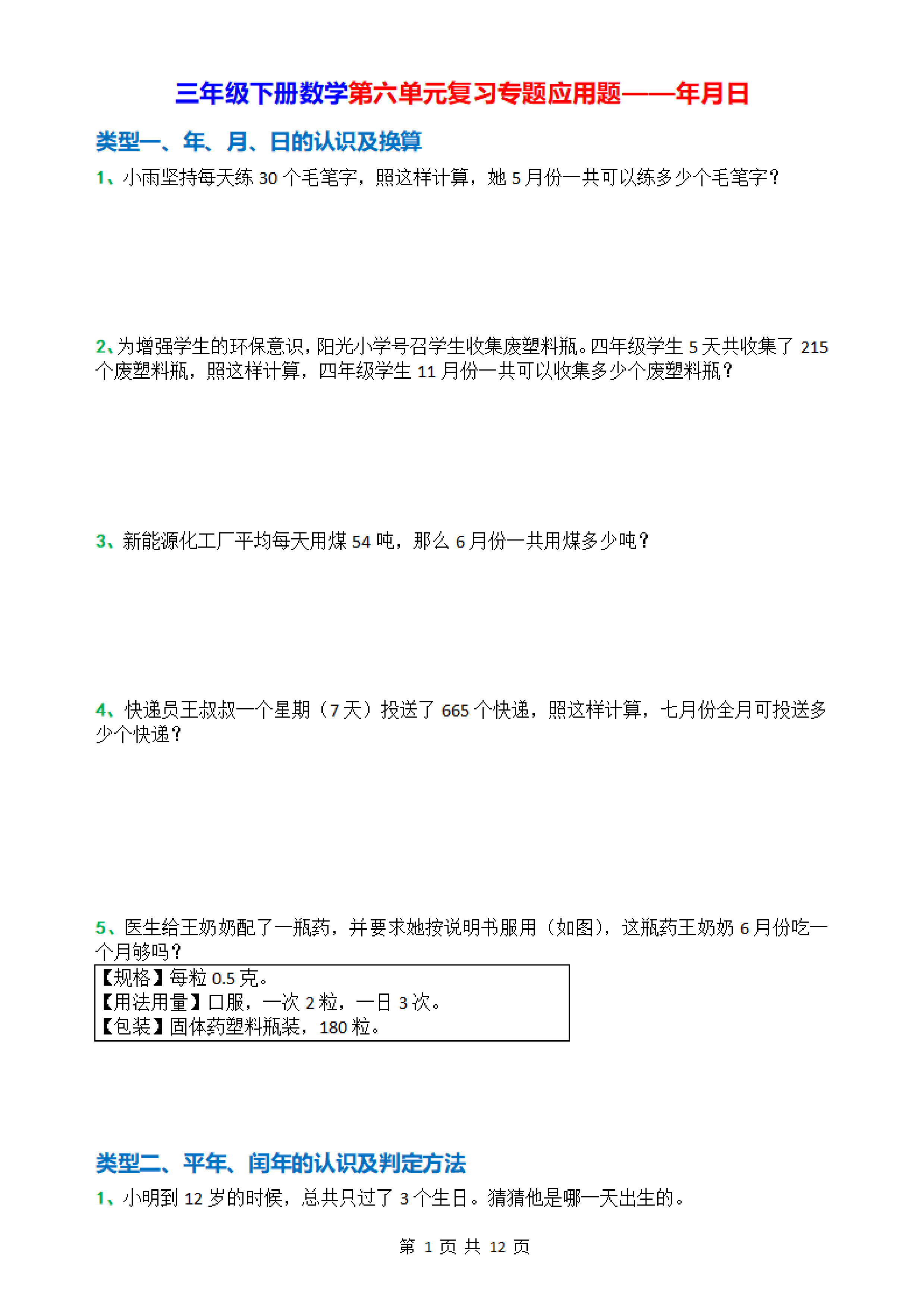 三年级下册数学第六单元复习专题应用题——年月日