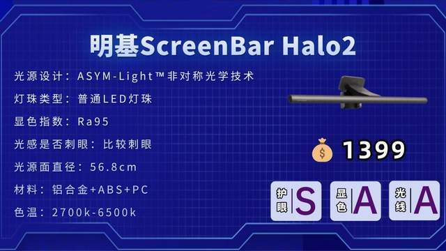 明基(BenQ)ScreenBar Halo2:提供三种补光模式,非对称设计几乎无屏幕反光,科技功能丰富,适合预算充足、追求专业级护眼的用户。