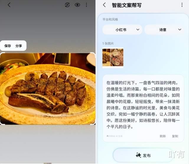 旅行的美好不仅需要记录,更需要分享。而社交分享的“最后一公里”难题,已经被三星Galaxy AI彻底解决。相册中长按旅拍照片拖放至社媒平台,系统会开启智能文案帮写工具,Galaxy AI便会自动解析画面内容——古镇街巷、山水风光结合用户选择的语气,生成适配不同平台的文案。针对小红书、微博等主流社交平台的调性差异,系统还内置9种风格模板,输入关键词后,即可生成带话题标签的完整文案,搭配智绘人像生成的卡通风格头像,让分享内容更具个性。这种“图片+文案”的一体化生成能力,大幅降低了创作门槛,让旅途中的见闻能即时转化为获赞内容。