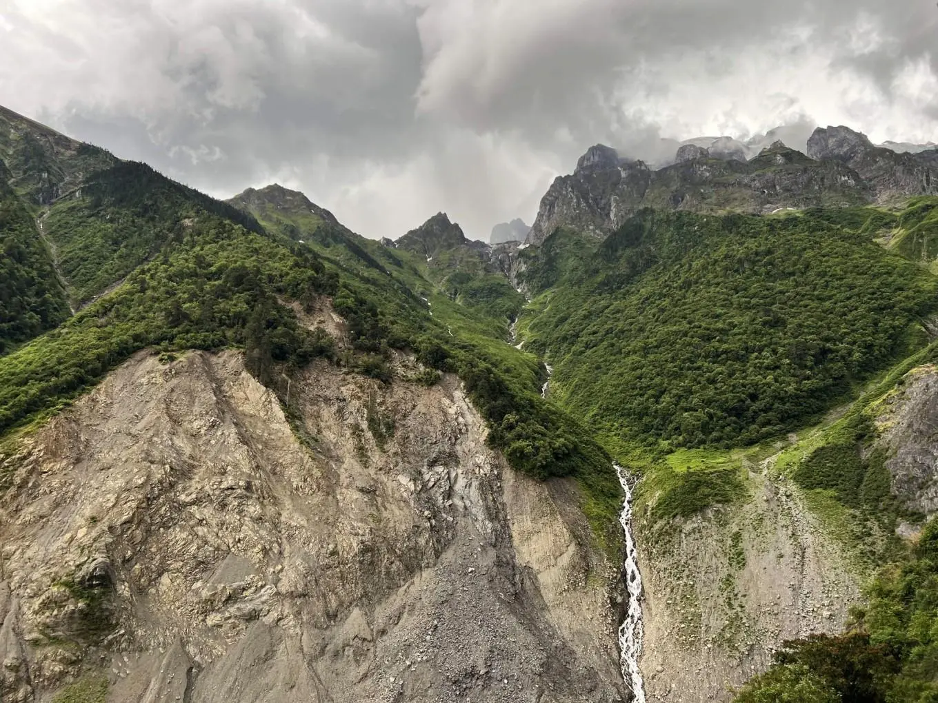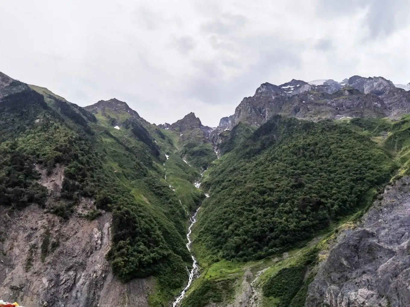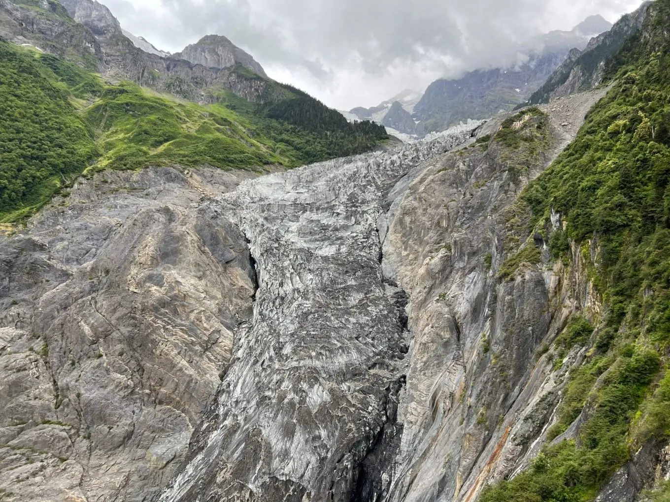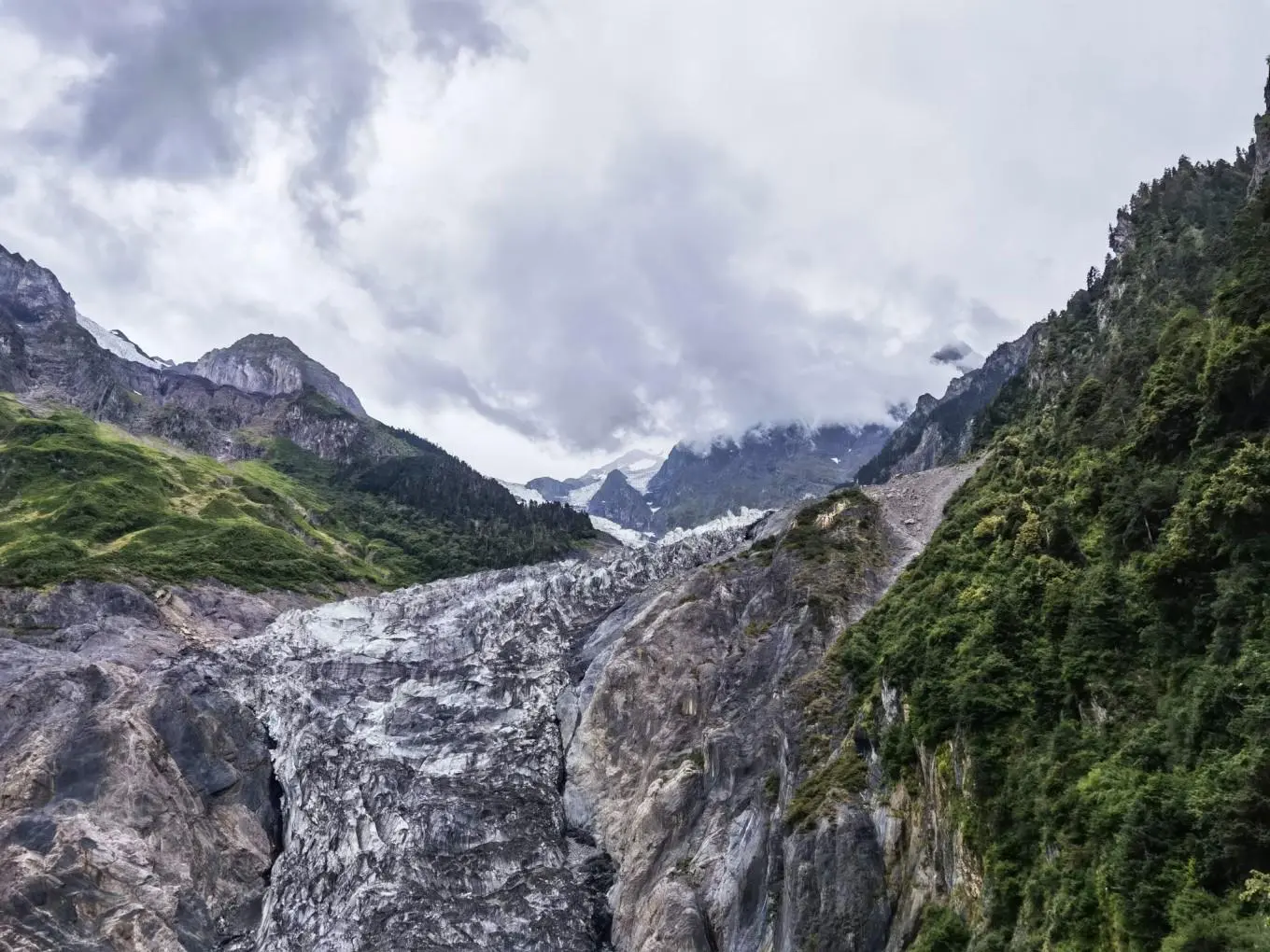 明永冰川从海拔6740米的梅里雪山往下呈弧形一直铺展到2600米的原始森林地带,所以这算一个低纬度低海拔的冰川了。真的到了冰川边上,雪山流下的冰舌完全颠覆我们对冰川的想象,没有洁白如雪的色彩,更没有晶莹剔透的蓝冰,展现在眼前的是夹杂灰色碎岩脏兮兮的冰块,用常人可理解的形象就是冬季城市道路下雪后,被清扫堆积在路边的积雪,又被车辆驶过溅起的污水所污染的积雪一样。冰川切割山体,乍一看和山体颜色别无二致。分析一下这冰川为什么会这样,大概率是冰冻使得岩石破碎,下泄的冰雪裹挟碎石,久而久之我们脑海中那种美好的蓝色冰川就成了眼前这毫不起眼的色彩。