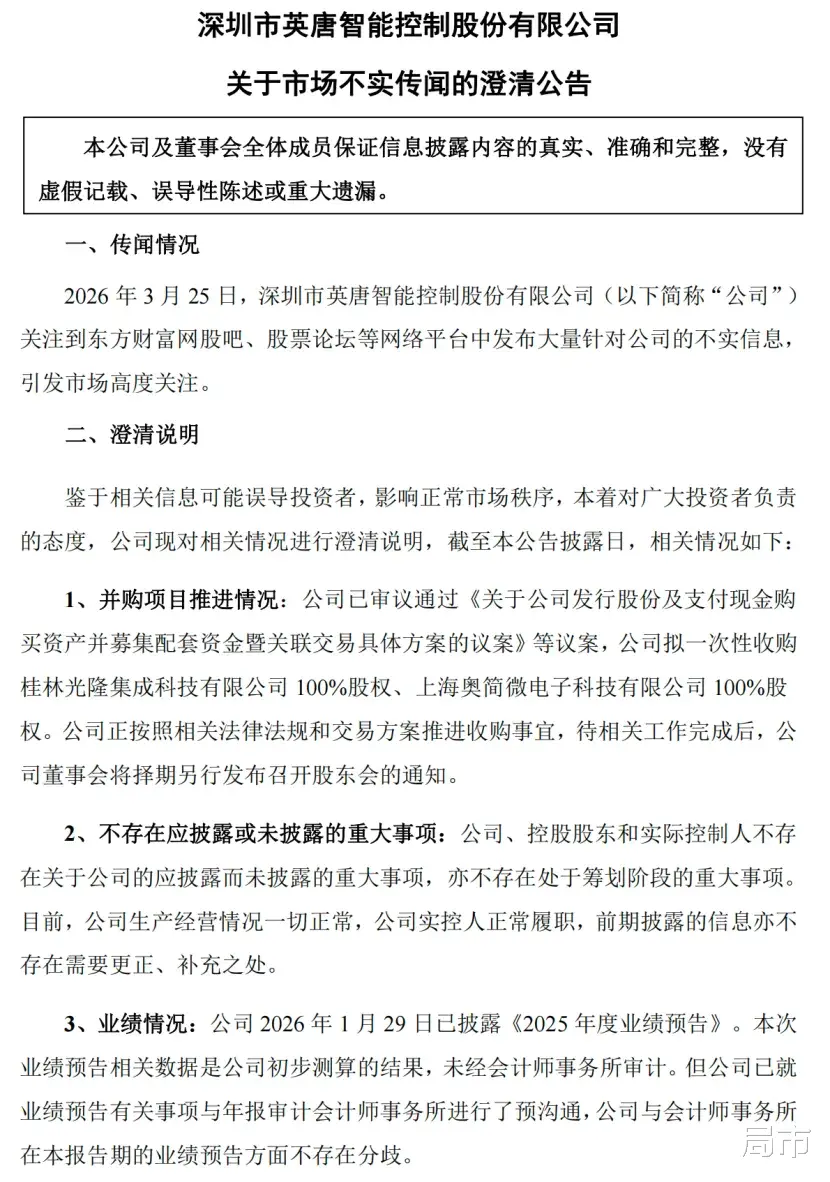 当日晚间,英唐智控紧急发布公告,称网络平台中存在大量针对公司的不实信息,并对此一一予以澄清。