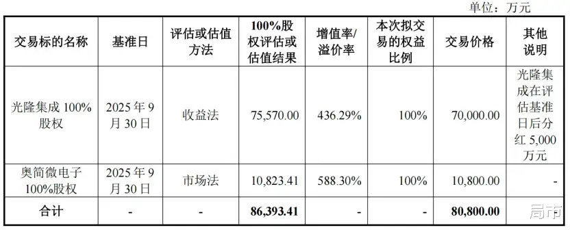 交易方案中,对光隆集成和简奥微电子分别采用收益法和市场法进行估值,增值率分别高达436.29%和588.30%。