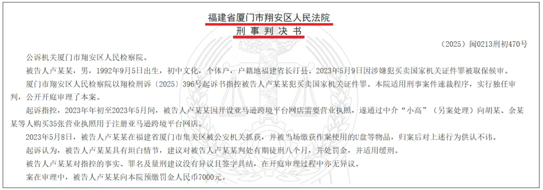 在第一起案件中,被告人卢某某为开设亚马逊跨境店铺,通过中介向胡某、余某某等人购买35份营业执照用于平台注册。尽管其初衷仅为开展“铺货”式电商业务,并无直接违法故意,但该行为已构成《中华人民共和国刑法》第二百八十条规定的买卖国家机关证件罪。