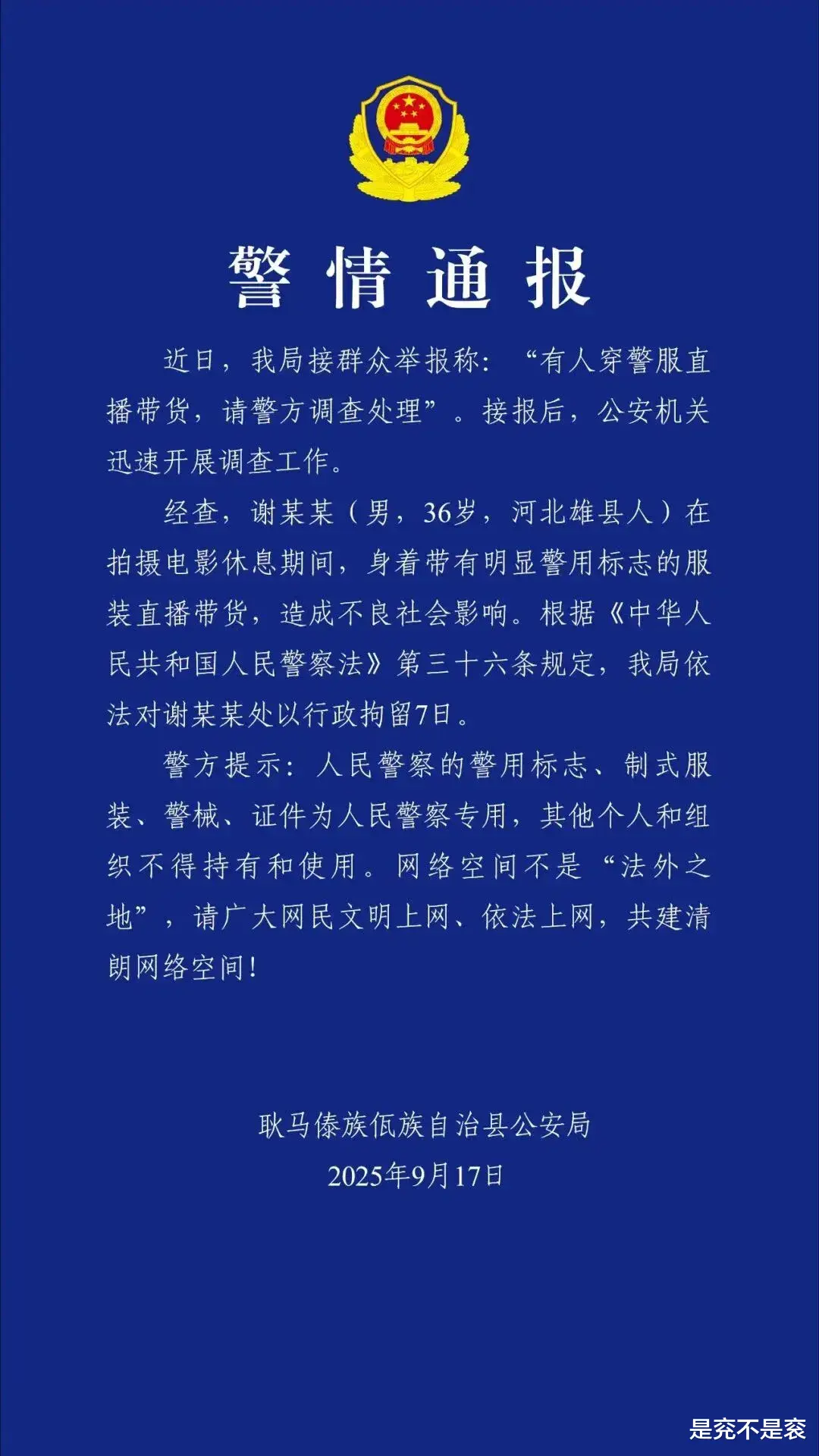 谢孟伟穿警服直播事件,警方发布通报,对其行政拘留7天。