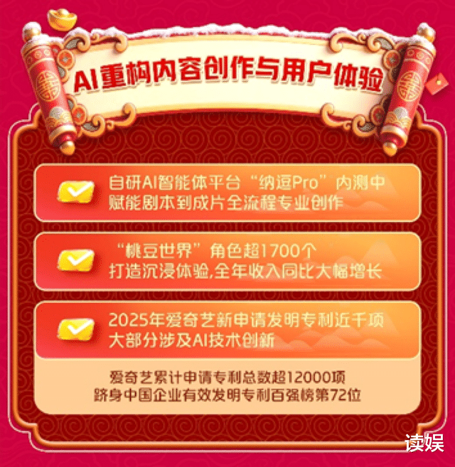其他内容方面,爱奇艺短剧储备已达2万部,其中免费内容占比超过70%。自制短剧累计上线超过150部,第四季度对会员收入、发行收入的贡献创新高。2026年短剧将聚焦自制内容的精品化和创新,同时提升内容的运营和商业化能力。平台布局以免费内容为核心的漫剧业务,目前爱奇艺漫剧内容储备超1万部,用户规模和播放时长快速增长。新一年,爱奇艺动漫将大幅扩充自制国漫矩阵;少儿频道在确保覆盖头部版权IP的同时,将提升自制规模,并拓展AI动画内容。