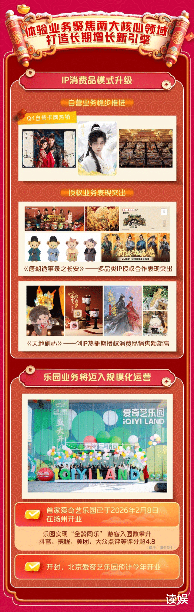 第四季度,IP消费品自营业务稳步推进,《赴山海》等卡牌热销。在IP 授权业务上,《唐朝诡事录之长安》在食品饮料、美妆、潮玩等多品类合作中表现突出;《天地剑心》创下热播期IP授权消费品销售额新高。2026年,爱奇艺在巩固授权业务的同时,将重点拓展自营IP消费品业务,把卡牌业务的成功经验复制到谷子、潮玩等更多品类。