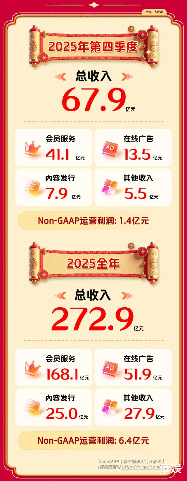 2月26日,爱奇艺(NASDAQ:IQ)发布截至2025年12月31日未经审计的第四季度及全年财报。全年总收入272.9亿元人民币,Non-GAAP(非美国通用会计准则)运营利润6.4亿元,连续四年运营盈利。其中,第四季度爱奇艺总收入67.9亿元,实现同环比双增长。Non-GAAP运营利润为1.4亿元。
