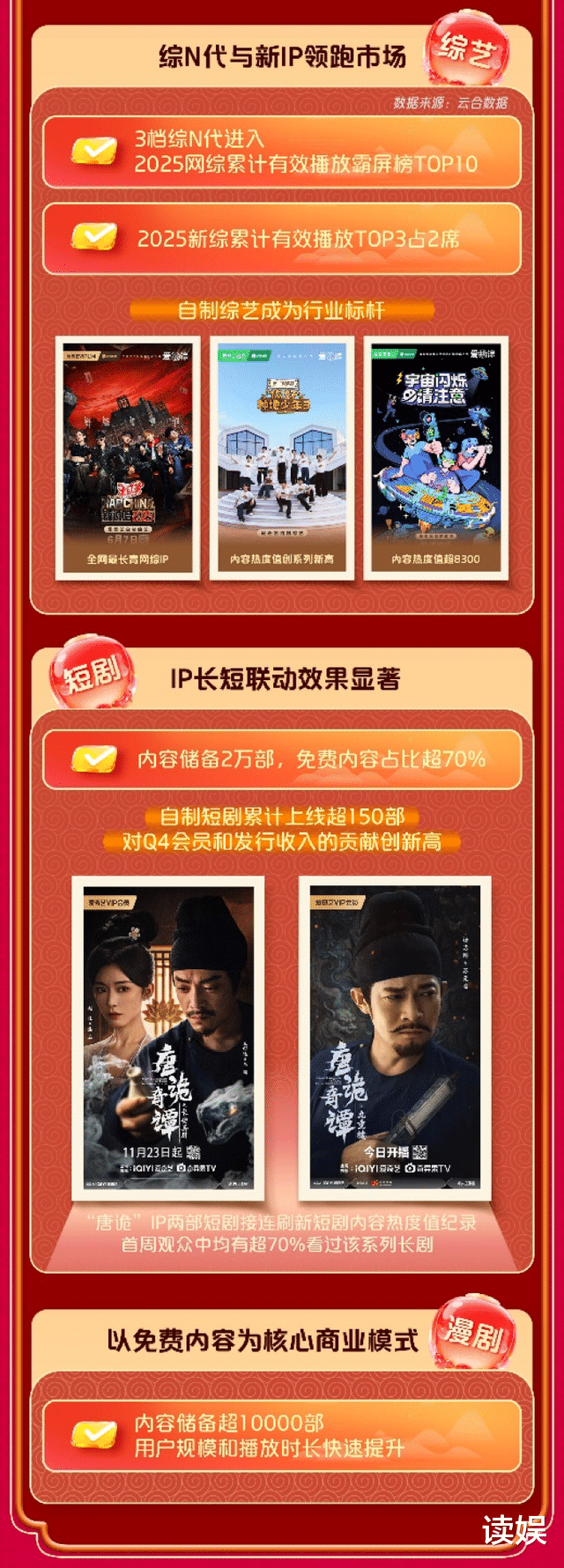 综艺方面,综N代和创新综艺均表现不俗。《你好种地少年3》内容热度值创系列新高;四季度上线的全新综艺《宇宙闪烁请注意》,内容热度值破8300。云合数据显示,2025年爱奇艺有3档综N代进入网综累计有效播放霸屏榜TOP10;新综艺累计有效播放TOP3中,爱奇艺占2席。2026年爱奇艺将继续深化对综N代的长线运营并探索创新IP。