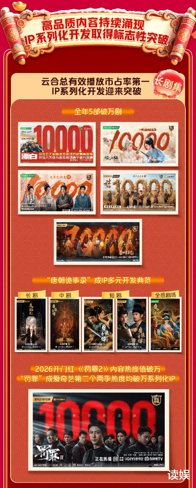 内容是爱奇艺发展的基石。长剧集方面,第四季度优质内容持续涌现,爱奇艺稳居云合剧集总有效播放市占率第一,IP系列化开发迎来突破。《唐朝诡事录》成为首个连续两季作品内容热度值破万的IP,《唐朝诡事录之长安》在2025年新上线剧集中广告收入表现第一,会员收入表现第二。短剧《唐诡奇谭之长安县尉》和《唐诡奇谭之九重楼》接连刷新短剧内容热度值记录。两部短剧首周观众中,均有超70%看过该系列长剧,显示多样化的内容形态有效延展了IP生命周期。2026开年,警匪刑侦剧《罚罪2》内容热度值破万,“罚罪”成为爱奇艺第二个两季内容热度值均破万的系列化IP。