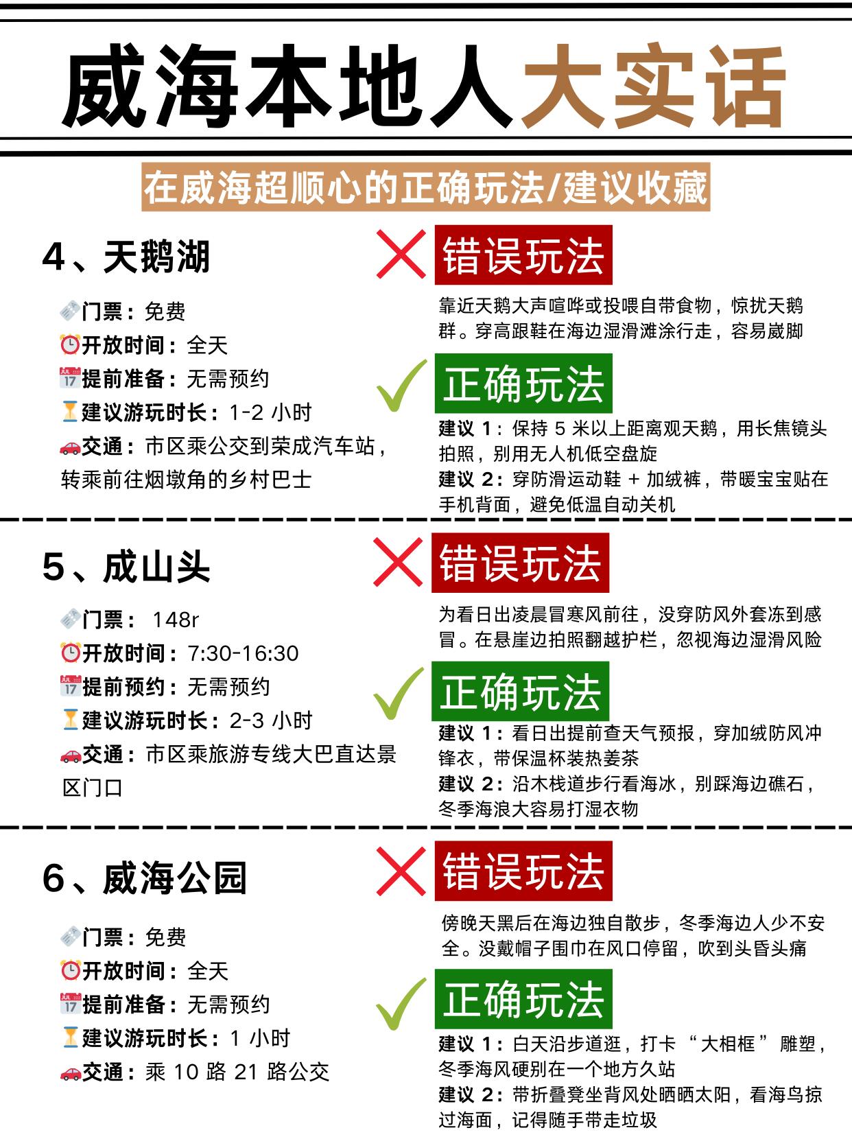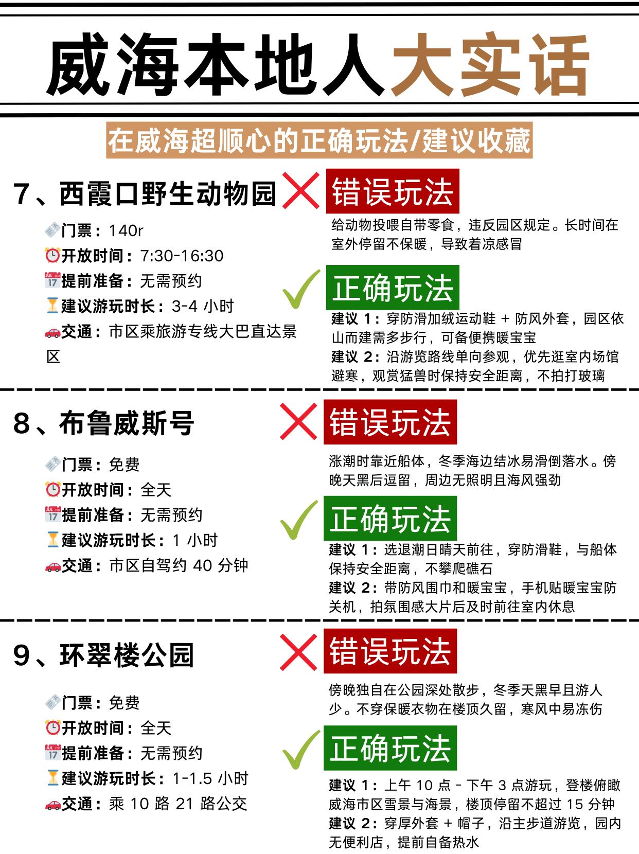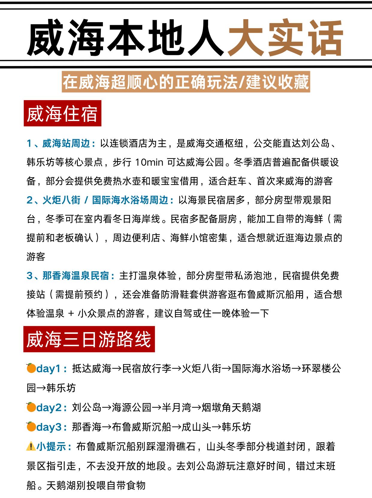 三日游路线直接抄作业🗺️:Day1 火炬八街→海水浴场→环翠楼→韩乐坊 Day2 刘公岛→威海公园→天鹅湖 Day3 那香海→布鲁威斯号→成山头最后碎碎念两句:想吃海鲜去巧克力渔家🍤,东北菜冲三点小吃🍲,都是本地人常去的 冬天去威海一定要带暖宝宝、厚帽子手套🧤!景区高价零食别买,真的不值