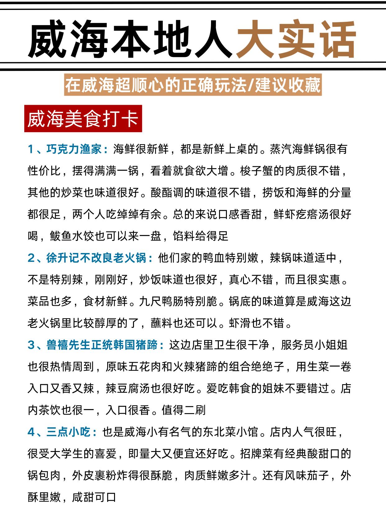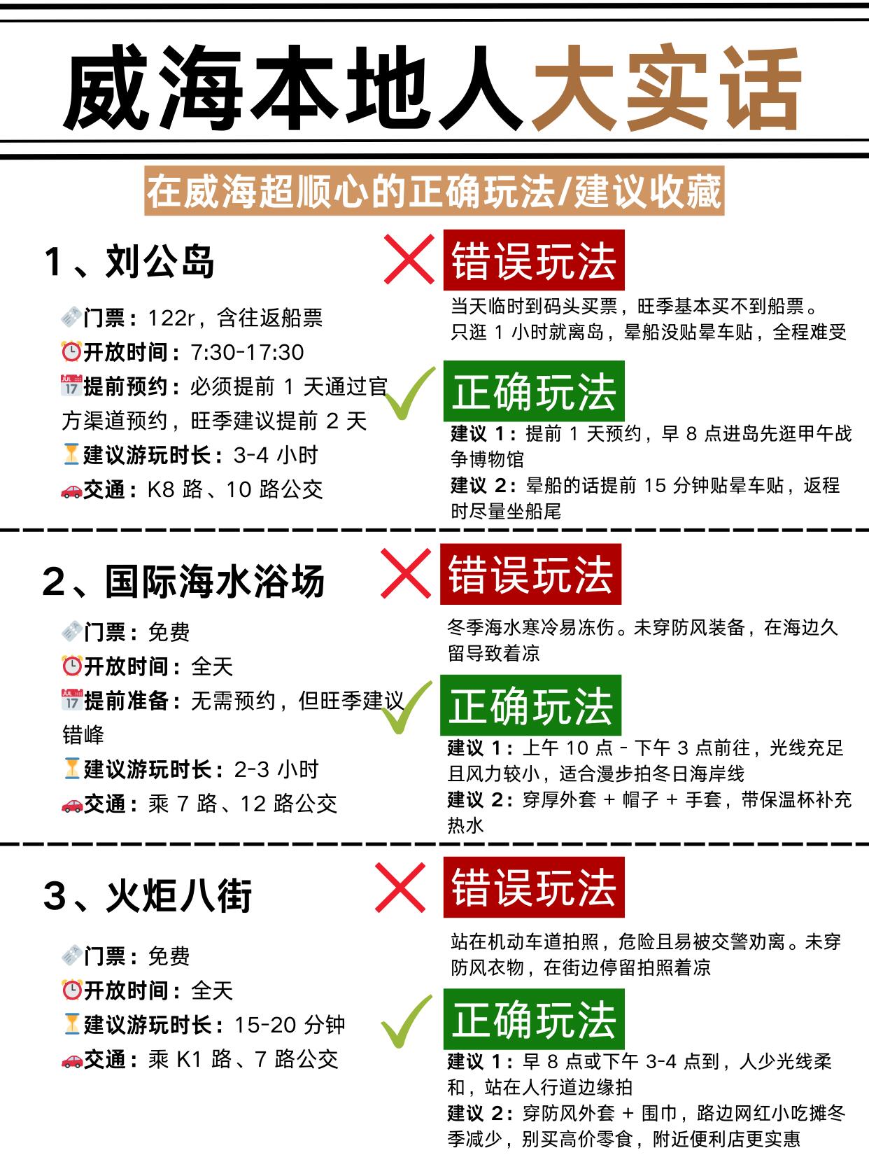 先说景点,1⃣️刘公岛🚢一定要提前 1-2 天官方约票,旺季当天根本抢不到。。晕船的宝提前贴晕船贴,返程坐船尾能舒服点。2⃣️国际海水浴场🌊推荐上午 10 点到下午 3 点去,风小还暖和,记得穿厚外套。3⃣️火炬八街📸别在机动车道拍照!早 8 点或下午 3-4 点去,人少还好拍 4⃣️街边高价零食别买💸,便利店啥都有。住宿我们当时选的威海站🏨,不用怎么拖行李,回去也方便。周边连锁酒店多,交通方便,去刘公岛、韩乐坊都近