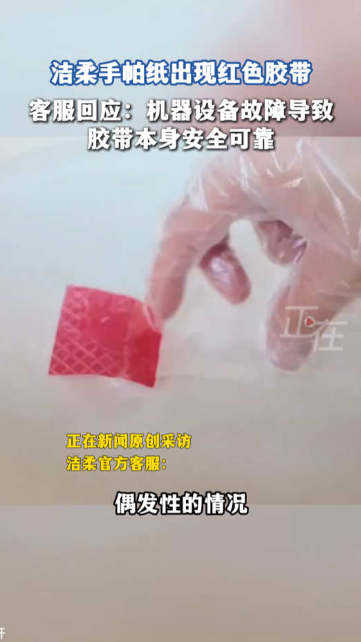 2025年11月24日消息,正在新闻报道,有消费者反映,自己购买的“洁柔缤纷系列手帕纸”,在使用过程中发现,手帕纸上竟贴有红色胶带,疑似生产线残留物。洁柔官方客服回应称,材料安全无毒,符合欧盟相关标准,且拥有检测报告。