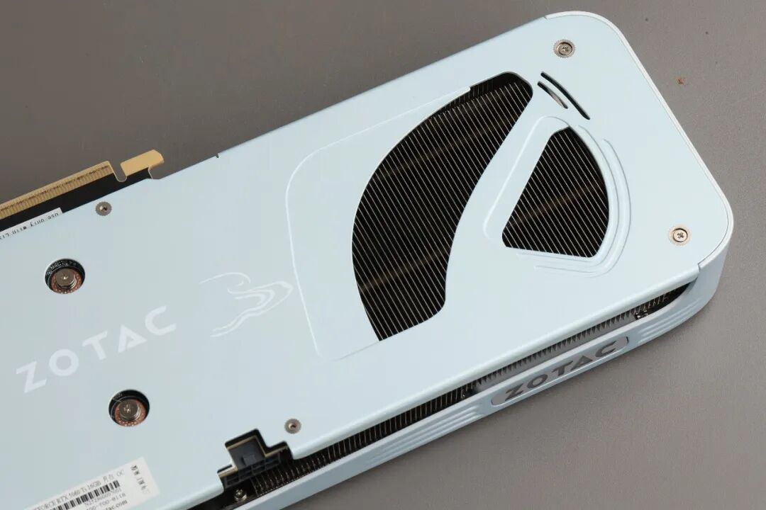 与此同时,索泰GeForce RTX 5060 Ti 8GB月白OC依旧保留了彰显其身份的核心设计元素,索泰英文Logo、“GEFORCE RTX”字样等标识清晰可见,于细节处彰显品牌底蕴与产品定位。接口与光效设计上,该显卡同样兼顾实用性与观赏性——顶部配备一枚8pin电源接口,设计简洁实用,能够方便用户更换老旧显卡时实现平滑过渡,无需额外更换电源,降低升级成本与操作难度;顶部的索泰Logo支持幻彩背光,玩家可通过FireStorm专属软件进行个性化调校,随心切换光效模式,让优雅格调中多了几分灵动气息。视频接口方面,这款显卡采用3×DP2.1b+1×HDMI 2.1b的经典配置,全面覆盖多屏显示、高清输出等多元需求,适配各类显示设备,满足玩家娱乐与创作者办公的双重需求;接口区域采用镂空设计进行点缀,既优化了视觉层次感,又兼顾了散热辅助功能,实现了美学与实用的相得益彰。