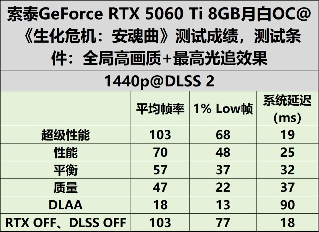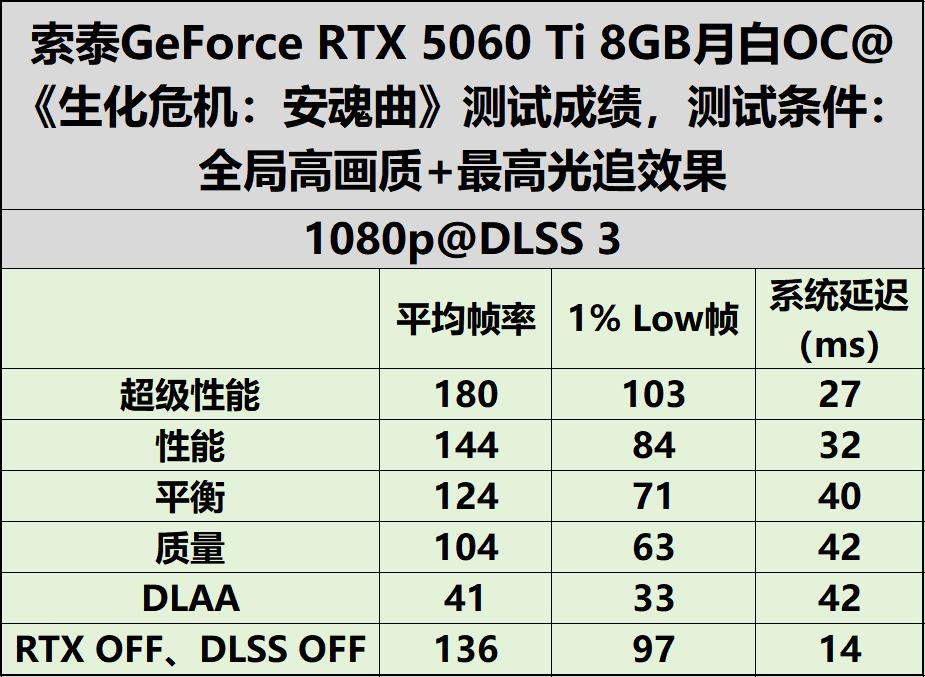 写在最后凭借丰富饱满的游戏内容,《生化危机:安魂曲》为我们的深度体验与性能测试提供了极为扎实的样本,其跌宕出彩的剧情与精良考究的画面表现,也让此番长时间测试物有所值、实至名归。在基础性能表现上,索泰GeForce RTX 5060 Ti 8GB 月白 OC展现出稳扎稳打、游刃有余的实力。即便在不开启DLSS的前提下,该显卡仍可在1080p分辨率、高画质预设且关闭光线追踪的设定下,实现流畅稳定的运行效果,轻松满足普通玩家的基础游玩需求,全程无明显卡顿与掉帧,运行状态从容不迫、稳定如一。若玩家追求极致沉浸的视觉体验,全套高画质与光线追踪效果自然不可或缺。值得称道的是,索泰GeForce RTX 5060 Ti 8GB月白 OC 依托DLSS 4技术加持,在平衡模式下可在无明显画质损失的前提下,轻松驾驭1440p分辨率下《生化危机:安魂曲》的严苛需求,帧率能够接近144fps,完美适配1440p高刷电竞显示器,实现视觉质感与流畅体验两全其美、相得益彰。