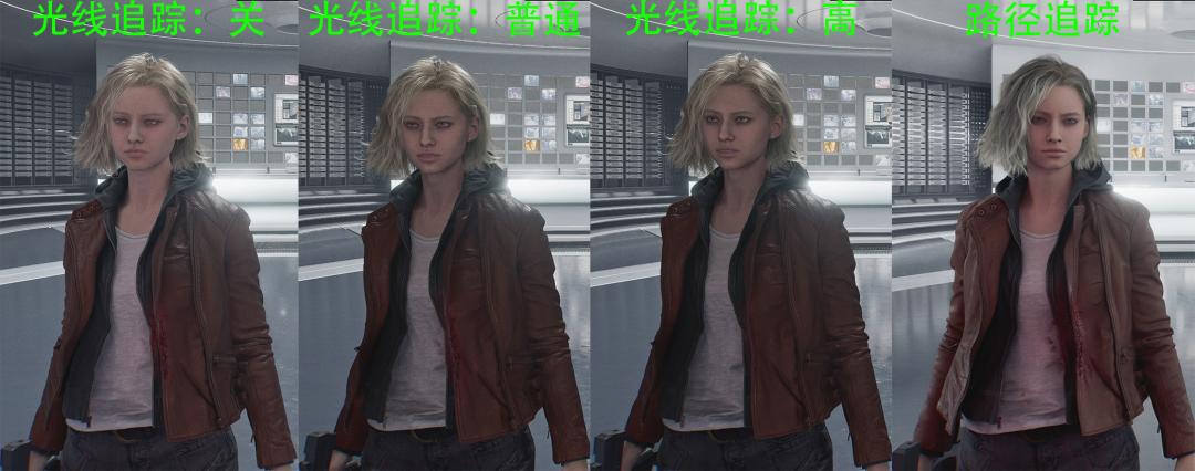 不仅如此,人物皮肤、毛发细节也会受到光线追踪等级的影响,毫不客气地说,在关闭光线追踪以及开启路径追踪下的“格蕾丝”恰如俩个人一样。