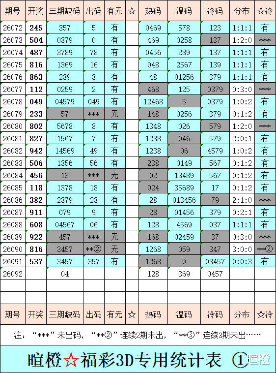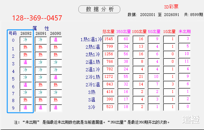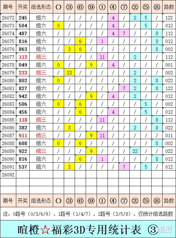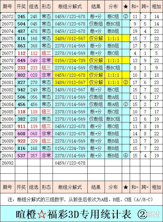 26092期:暄橙福彩3D综合条件(本期将在4月12日21:15开)一、上期回顾 ☆1、上期开奖号:5 3 7。2、和值= 15,跨度= 4。3、非常态组六,012路组合。4、热度分布(热:温:冷)0:0:3。二、本期条件 ☆1、三期缺码:04。2、热:128,温:369,冷:0457。3、断组分解式:0459//123-678。4、四胆:1469;三胆:149。三、术语解释 ☆1、三期缺码:0至9这十个自然数当中,未在近三期开奖号出现的数字。2、热度(热温冷):自然数0至9,在近七期开奖号中,出现3次及3次以上的数字,称为热码;出现2次的数字,称为温码;出现1次和未出现的数字,称为冷码。某个数字在开奖号中出现几个,就按几次计算。3、断组分解式:将0至9这十个自然数,分成三组数字,从前往后依次为A组(4码)、B组(3码)、C组(3码),一般情况下,有一组数字不出码,偶尔会有两组数字不出码。A组不出码的情况相对较少。断组为主,分解为辅。4、常态组六号码:同时包含大数、小数、奇数、偶数、质数、合数的组六号码,共有72注。统计表中,简称“常态”。5、非常态组六号码:全大数、全小数、全奇数、全偶数、全质数、全合数等六种形态的组六号码,共有48注。统计表中,简称“非常”。★提醒:彩市有风险,参与须谨慎!水平有限,仅供参考!