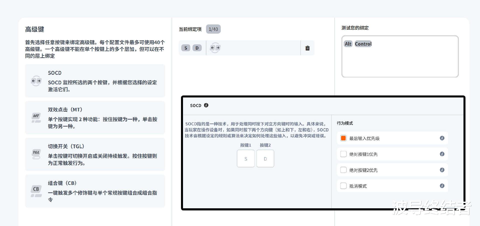 功能方面,GANSS 3101T Pro把目前机械轴能做的,比较热门的几个功能都做了进去,比如SOCD。虽然不像磁轴一样能做到一次按键多次触发,但是加上双效点击,切换开关等功能,也很够用了。值得一提的是,不同的竞技比赛,对SOCD功能的规定各不相同,如果参赛的话一定要先找主办方问清楚。