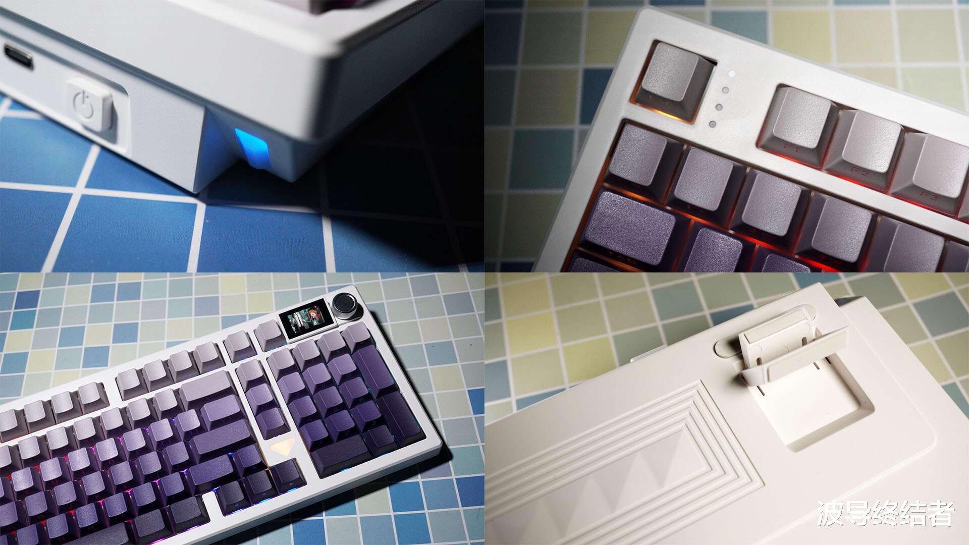 键盘在左右两个角落额外安排了全彩RGB灯,状态指示灯则巧妙地藏在了ESC和F区之间。底部脚撑给了2段,可以适应三种不同的键盘使用角度。内置8000mAh的大容量锂电池,在关闭背光的情况下可以支持约100小时的续航,屏幕上可以直接显示电量,也可以长按Fn根据数字区的灯光来查看。