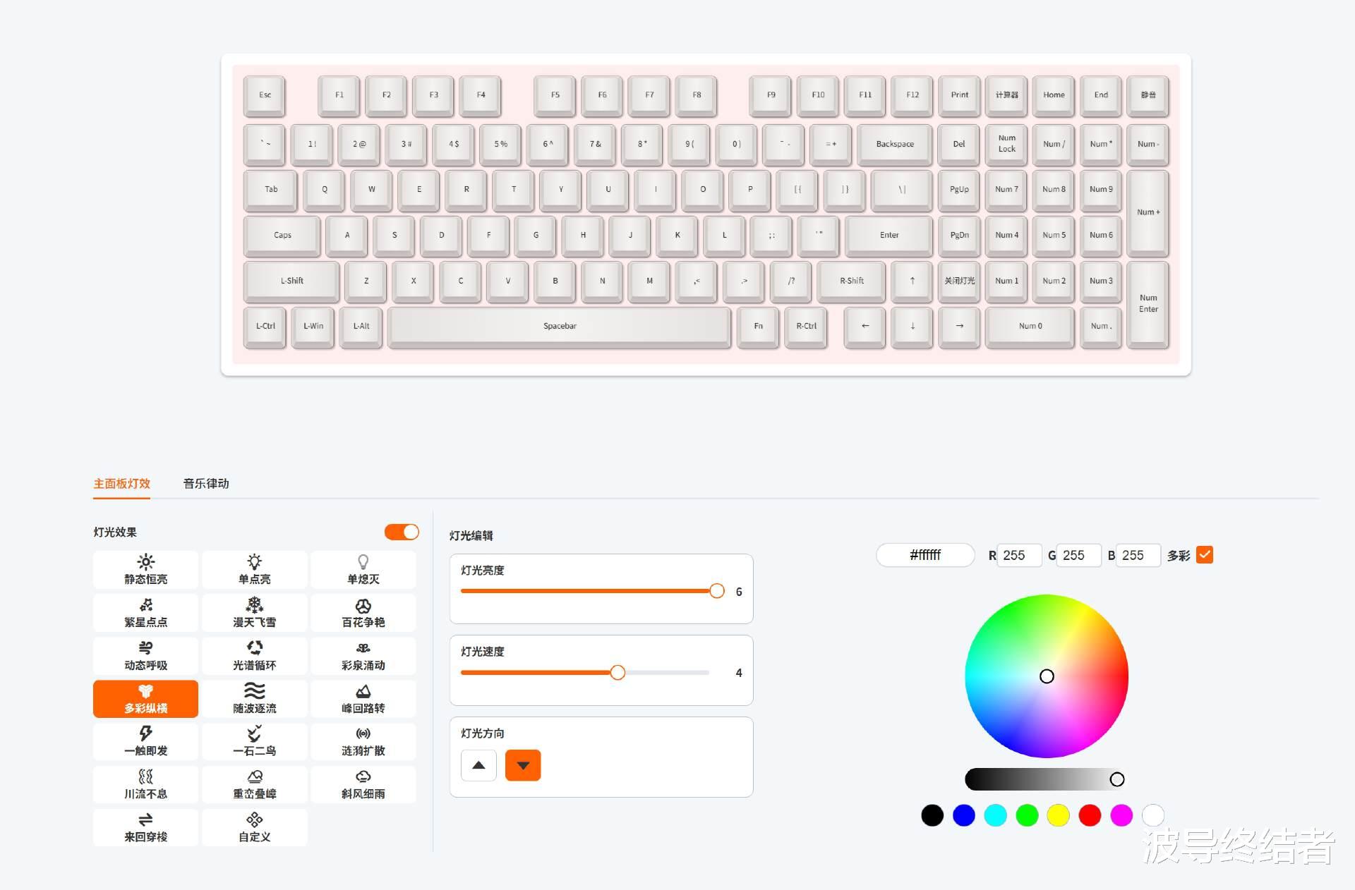 灯光方面,自带的将近20种方案已经很够用,如果想自定义,也可以细到每一个按键单独一种灯效,或者灯光跟随音乐律动。